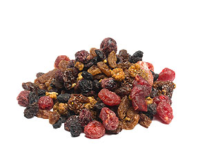 Morango, arandos, fisália, cereja, amora e uvas passas.